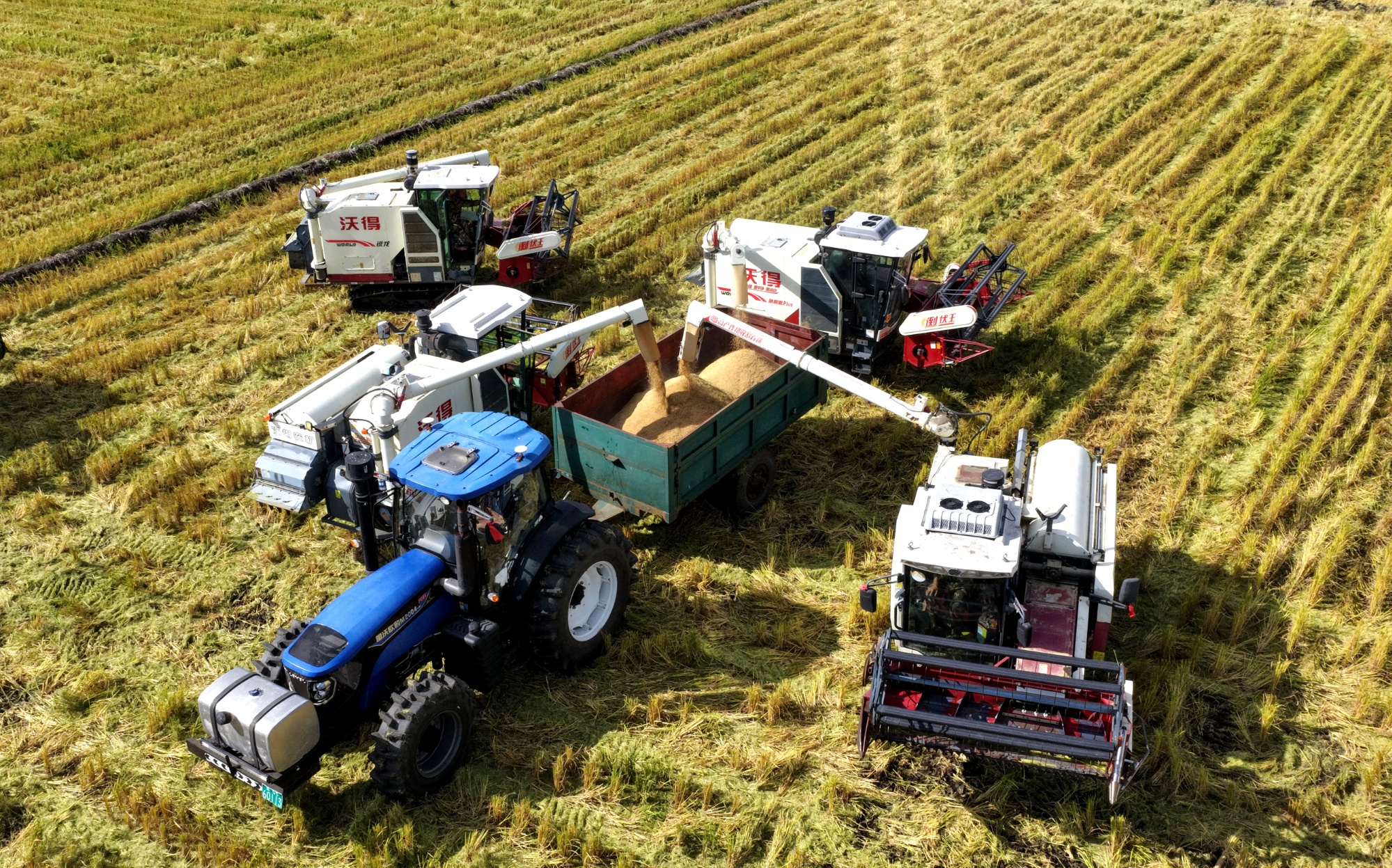 金秋九月,稻谷飘香。9月7日,北大荒农业股份友谊分公司第九管理区第六作业站水稻进入成熟期,九台履带式收割机在稻田中络绎往复,四台接粮拖拉机将收成的水稻运到客商的收粮车边装车。水稻田中,多机齐上,来回络绎轰鸣作业,大规模的水稻“撸青”作业构成了一幅壮丽的秋收画卷,标志着本年秋收作业的全面铺开和高效推动。