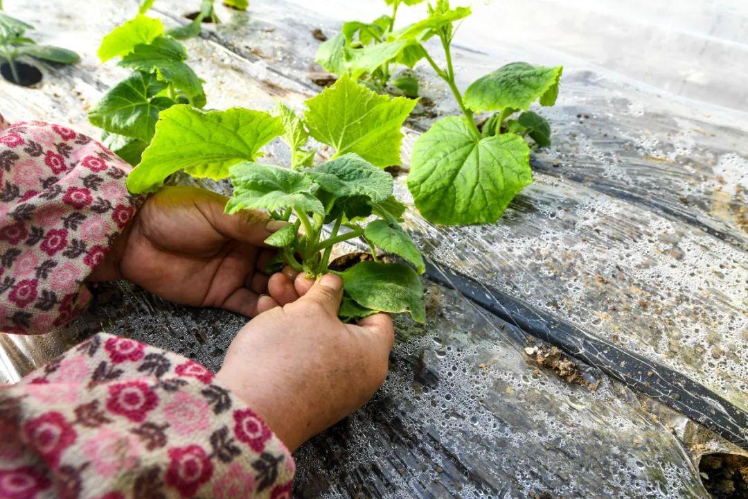 2月12日,在吉林市永吉县西阳镇兴隆川村大棚内,乡民检查作物成长状况。新华社记者 张楠 摄